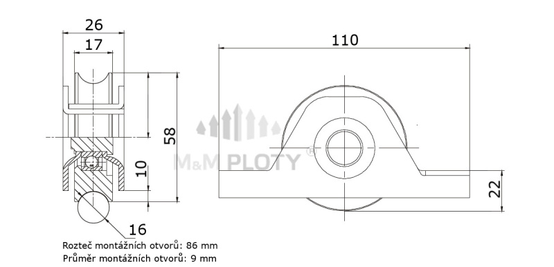 Rozměry naleznete v technickém nákresu. Pro tento typ kolečka je nutné použití kolejnice typu U. Správný typ kolejnice naleznete dole ve složce Související produkty.