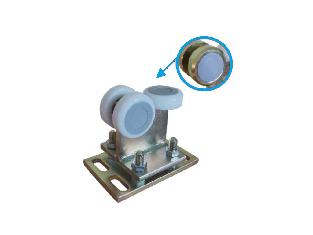 Pojezdový vozík se používá jako nosný prvek pro samonosné posuvné brány. Vozík je osazen pevnou deskou s možností výškové regulace. Rolny ze silonu splňují požadavky na vysokou životnost a tichý chod brány, bez nutnosti mazání.