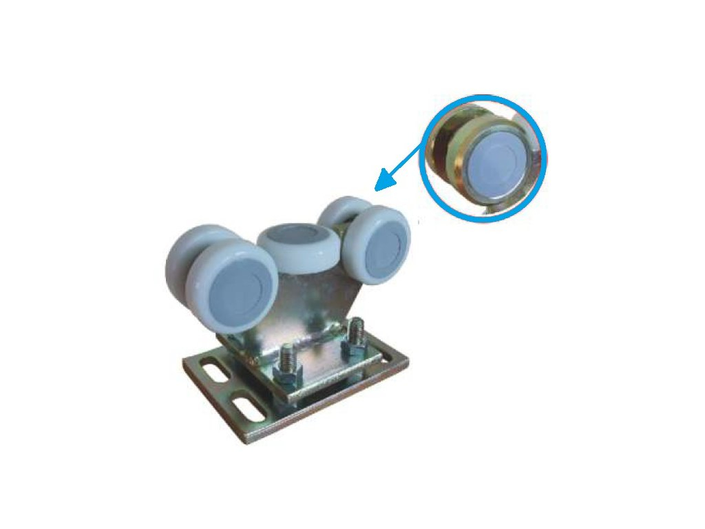 Pojezdový vozík se používá jako nosný prvek pro samonosné posuvné brány. Vozík je osazen pevnou deskou s možností výškové regulace. Rolny ze silonu splňují požadavky na vysokou životnost a tichý chod brány, bez nutnosti mazání.