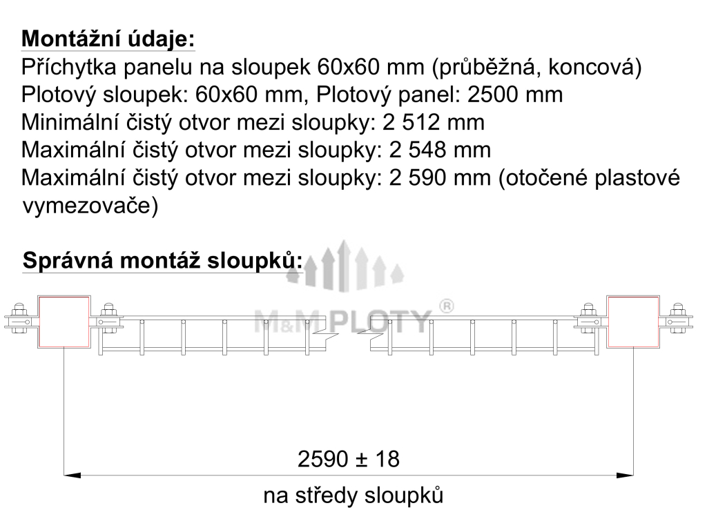 Správný počet příchytek na jeden panel je dán výškou oplocení a je uveden u každého plotového panelu. Při montáži plotových sloupků je nutné dodržet středovou rozteč sloupků 259 cm, viz. technický nákres mezi obrázky.